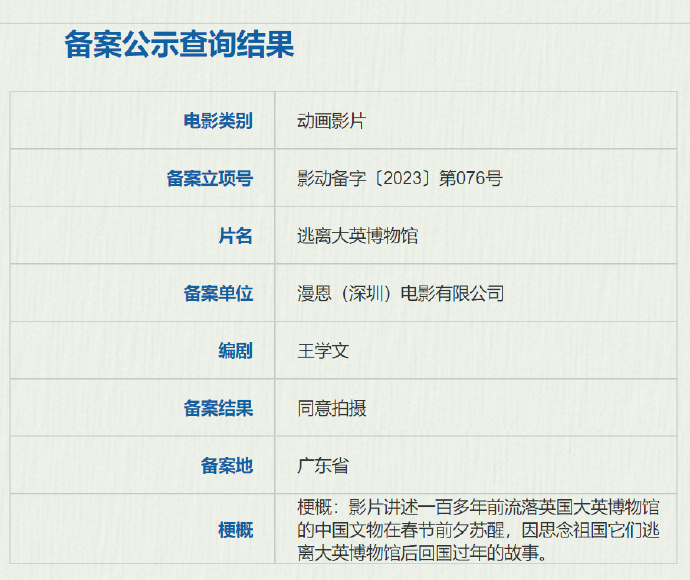 『逃离大英博物馆』动画影片 备案立项公示 动漫 9月17日 天然国家特级保护废物 取消关注 关注 私信 梗概:影片讲述一百多年前流落英国大英博物馆的中国文物在春节前夕苏醒,因思念祖国它们逃离大英博物馆后回国过年的故事。